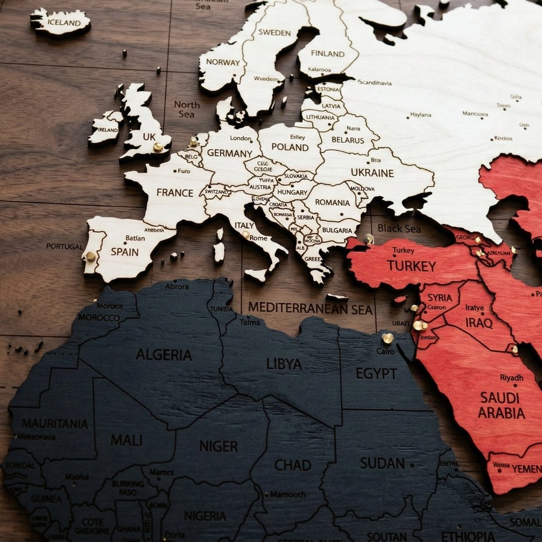 A romantic wooden world map designed for couples, featuring personalized names, special dates, and love-themed engravings.